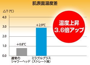 温もり入浴後もぽかぽか※ストレート水流のみで、ミスト水流では温まり効果は認められません。一般的なシャワーヘッドとミラブルplusを使用した後の肌の表面温度を測定しました。ミラブルplusでは、従来のシャワーヘッドを使用した場合より平均3.6倍の温度上昇となり、シャワーだけでも温まります。 |