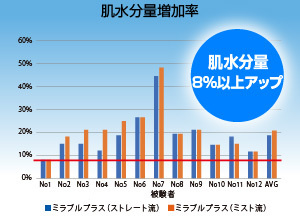 水分量肌水分量約8%upシャワー後の潤いが持続ミラブルplusを使用した後の肌の水分量を測定。ミラブルplus使用後は使用前と比較して肌の水分量が8%以上アップ。お湯が肌に浸透して潤いを与えます。 |