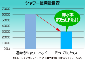節水お財布に優しい水の勢いは変わらず使用量を節約節水効果で、お財布にも優しいウルトラファインミスト ミラブルplus! |